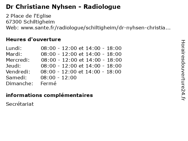 1 Dr Christiane Nyhsen - Radiologue (Distance: 2,67 km) 8 Place Kléber, 67000 Strasbourg christiane, diagnostique, dr, imagerie, nyhsen, radiologie, radiologue, thérapeutique 2 Dr Christiane Nyhsen - Radiologue (Distance: 3,15 km) 1 Rue de Zagreb, 67300 Schiltigheim christiane, diagnostique, dr, imagerie, nyhsen, radiologie, radiologue, thérapeutique 3 Dr Christiane Nyhsen - Radiologue (Distance: 4,22 km) 35 Avenue du Rhin, 67100 Strasbourg christiane, diagnostique, dr, imagerie, nyhsen, radiologie, radiologue, thérapeutique 4 Dr Christiane Nyhsen - Radiologue (Distance: 5,17 km) 4 Rue Catherine Kany, 67000 Strasbourg christiane, consultation, docteur, dr, med, médecin, nyhsen, radiologue, traitement 5 Dr Christiane Nhysen - Radiologue (Distance: 0,00 km) 2 Place de l'Église, 67300 Schiltigheim christiane, dr, médecin, médecine, médical, nhysen, pharmaceutique, radiologue, secretariat, traitement 6 Dr Christiane Gross Diss - Chirurgien-dentiste - secrétariat (Distance: 2,51 km) 26 Rue de la Mésange, 67000 Strasbourg chirurgien, chirurgien-dentiste, christiane, dentiste, diss, dr, gross, médecins, médicaments, santé, secrétariat, spécialiste |