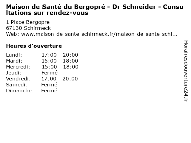 Termes de recherche pour Maison de Santé du Bergopré - Dr Schneider - Consultations sur rendez-vous:du, sur, de, bureau, maison, vous, med, medecine, santé, rendez, maladie, traitement, médecin, schneider, consultation, dr, consultations, pratique, therapie, bergopré |