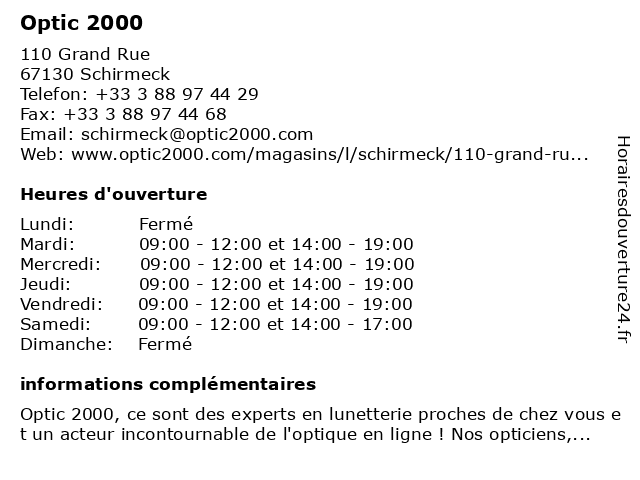 1 Optic 2000 (Distance: 19,32 km) 64 Rue du Général Gouraud, 67210 Obernai 2000, lunettes, optic, opticien, optique 3 Opticien Obernai - Optic 2000 (Distance: 19,63 km) 64 Rue du Général Gouraud, 67210 Obernai 2000, lentilles de contact, lunettes de soleil, lunettes de vue, obernai, optic, optic2000, opticien, opticien optic2000, ray-ban, rayban 4 Optic 2000 (Distance: 21,38 km) 21 Place de l'Hôtel de Ville, 67120 Molsheim 2000, lunettes, optic, santé, solaires 5 Opticien Wasselonne - Optic 2000 (Distance: 24,43 km) 5 Place du Général Leclerc, 67310 Wasselonne 2000, lentilles de contact, lunettes de soleil, lunettes de vue, optic, optic2000, opticien, opticien optic2000, ray-ban, rayban, wasselonne 6 |