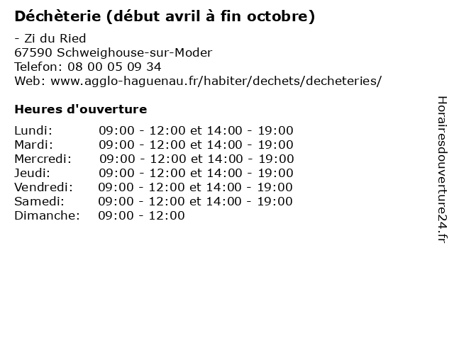 1 Déchèterie (de début novembre à fin mars) (Distance: 0,00 km) - Zi du Ried, 67590 Schweighouse-sur-Moder de, dechets, dechetterie, début, décheterie, déchèterie, fin, mars, novembre 2 Cimetière Saint-Nicolas - Octobre (Distance: 3,15 km) 1 Route de Forstheim, 67500 Haguenau arbre, cimetiere, cimetière, espace vert, forêt, funeraire, jardin, loisirs, nature, nicolas, octobre, parc, prairie, saint, square 3 Cimetière Saint-Georges - Octobre (Distance: 4,19 km) 1 Route de Marienthal, 67500 Haguenau arbre, cimetiere, cimetière, espace vert, forêt, funeraire, georges, jardin, loisirs, nature, octobre, parc, prairie, saint, square 4 Déchèterie (du 15 mars au 31 octobre) (Distance: 9,06 km) 1 rue de l'Obermatt, 67240 Bischwiller 15, 31, au, du, déchèterie, gravats, huiles usées, la réception des déchets et écocentres, les appareils électroménagers, les déchets verts, mars, octobre, papier et carton en quantité 5 Déchèterie (du 1er avril au 31 octobre) (Distance: 9,57 km) - rue de Weitbruch, 67240 Gries 1er, 31, au, avril, dechets, dechetterie, du, décheterie, déchèterie, octobre 6 Déchèterie (du 1er avril au 31 octobre) (Distance: 10,24 km) - ZA Nord du Val de Moder, 67372 Val de moder 1er, 31, au, avril, dechets, dechetterie, du, décheterie, déchèterie, octobre |
