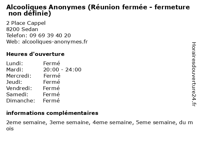 Termes de recherche pour Alcooliques Anonymes (Réunion fermée - fermeture non définie):reunion, non, fermeture, alcooliques, anonymes, définie, fermée |