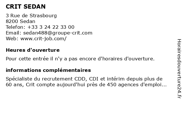1 Crit Interim (Distance: 0,11 km) - place Alsace Lorraine, 08200 Sedan agence, crit, emplois, interim, job, professionnelle, qualifications, recherche 2 CRIT CHARLEVILLE-MEZIERES (Distance: 18,74 km) 68 Avenue Charles Boutet, 08000 Charleville-Mézières charleville, crit, mezieres |