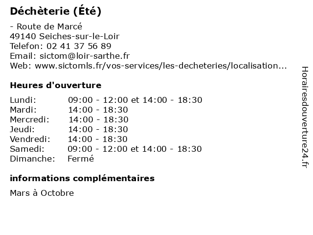 1 Déchèterie (Été) (Distance: 10,50 km) - Chemin des Cuetteries, 49125 Tiercé bennes, collecte, débarras, déchets, déchèterie, détritus, tri, été 2 Déchèterie (Été) (Distance: 15,96 km) - lieu-dit Le Petit Guichard, 49480 Saint-Sylvain-d'Anjou 1/04, 31/10, au, du, déchèterie, gravats, huiles usées, la réception des déchets et écocentres, les appareils électroménagers, les déchets verts, papier et carton en quantité, été 3 Déchèterie (Hiver) (Distance: 0,00 km) - Route de Marcé, 49140 Seiches-sur-le-Loir déchèterie, gravats, hiver, huiles usées, la réception des déchets et écocentres, les appareils électroménagers, les déchets verts, papier et carton en quantité 4 Déchèterie professionnelle Brangeon Recyclage Tiercé (Distance: 10,61 km) Chemin des Cuetteries, 49125 Tiercé brangeon, déchèterie, professionnelle, recyclage, tiercé 5 Déchèterie (Distance: 13,61 km) - Mairie, 72220 Crosmières déchèterie, gravats, huiles usées, la réception des déchets et écocentres, les appareils électroménagers, les déchets verts, papier et carton en quantité 6 Déchèterie (Distance: 14,87 km) - de Chateauneuf, 49330 Châteauneuf-sur-Sarthe déchèterie, gravats, huiles usées, la réception des déchets et écocentres, les appareils électroménagers, les déchets verts, papier et carton en quantité |