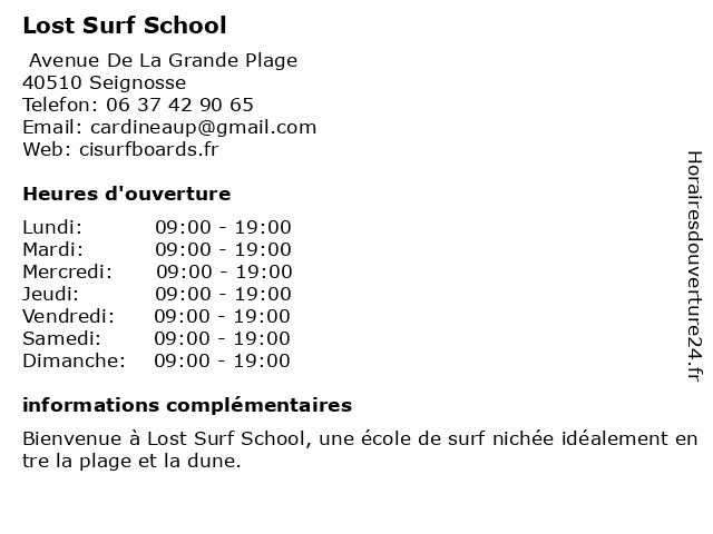 1 Wawa Surf School école de surf seignosse (Distance: 0,42 km) 27 Avenue de la Grande Plage, 40510 Seignosse de, school, seignosse, surf, wawa, école 2 Ocean Therapy Surf School (Distance: 3,82 km) 808 Boulevard Front De Mer, 40150 Soorts-Hossegor magasin de vêtements de sport, ocean, school, surf, therapy, tour-opérateur 3 Le Petit Surf (Distance: 5,16 km) 1379 Route De l Etang Blanc, 40510 Seignosse demon, jordane, petit, restaurants, surf 4 Lost South Central (Distance: 5,80 km) 92 Avenue des Remouleurs, 40150 Soorts accessoires, central, lost, south, surf, vêtements, équipement 5 Fédération Française de Surf (Distance: 5,98 km) 123 Boulevard de la Dune, 40150 Soorts-Hossegor adhérents, de, française, fédération, surf 6 Les Echasses Golf & Surf Eco Lodge (Distance: 7,84 km) 701 Route de La Bruyere, 40230 Saubion echasses, eco, golf, hôtel, les, lodge, restaurant, surf, tourisme |