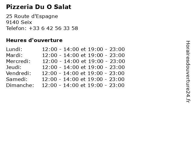 | Mardi | 12:00-14:00 et 19:00-23:00 |