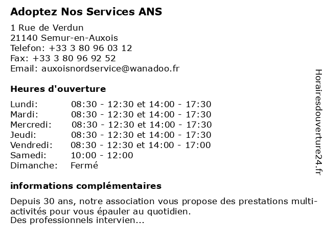 1 ANS (Adoptez Nos Services) (Distance: 0,05 km) 1 rue de Verdun, 21140 Semur-en-Auxois adoptez, ans, garde d'enfants, nos, services, services à la personne 2 Enterprise Rent-a-Car (Distance: 54,84 km) 29 Cours De La Gare, 21000 Dijon car, de voiture, enterprise, large gamme de véhicules, location de véhicule utilitaire, nos meilleurs, rent 3 Adoptez Nos Services ANS (Distance: 57,06 km) 6 Impasse de Reggio, 21000 Dijon adoptez, ans, nos, services |