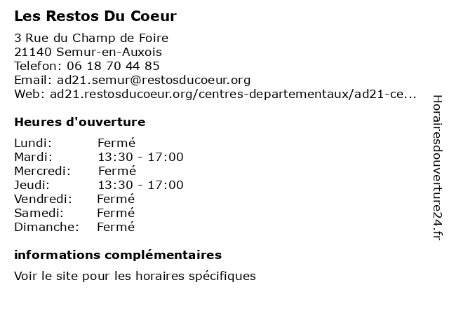 1 Les Restos Du Coeur (Distance: 10,72 km) 3 avenue de Dijon, 21150 Venarey les Laumes aides, alimentaire, coeur, du, les, restos, santé, solidarité, soutien 2 Les Restos Du Coeur (Distance: 14,17 km) 10 Rue Alfred Debussy, 21500 Montbard aides, alimentaire, coeur, du, les, restos, santé, solidarité, soutien 3 Les Restos Du Coeur (Distance: 18,61 km) - Place du Docteur Quignard, 21350 Vitteaux aides, alimentaire, coeur, du, les, restos, santé, solidarité, soutien 4 LES COUPS DE COEUR DE SOPHIE (Distance: 1,04 km) 1 Route De Massene, 21140 SEMUR-EN-AUXOIS coeur, coups, de, les, sophie 5 Secours Catholique (Distance: 0,17 km) 7 Rue du Champ de Foire, 21140 Semur en Auxois associatif, association, bénévolat, bénévole, catholique, secours, solidaire, solidarité 6 Les Restos Du Coeur (Distance: 43,33 km) 11 Rue Albert Camus, 21400 Châtillon-sur-Seine aides, alimentaire, coeur, du, les, restos, santé, solidarité, soutien |