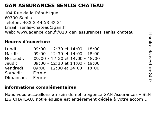 1 GAN Assurances - SENLIS VENERIE (Distance: 0,00 km) 104 Rue de la République, 60300 Senlis assurances, gan, senlis, venerie 2 Sarl Chateau Mandarin (Distance: 8,38 km) 62 Rue Du Connetable, 60500 Chantilly chateau, mandarin, restaurants 3 GAN ASSURANCES CHANTILLY (Distance: 8,39 km) 64 Rue du Connétable, 60500 Chantilly assurances, chantilly, gan 5 Gan Assurances (Distance: 10,58 km) 23 avenue Antoine Chanut, 60100 Creil agence, assurances, courtier, gan, protection, sinistres 6 Le Chateau De La Tour (Distance: 11,59 km) Rue De La Chaussee, 60270 Gouvieux chateau, restaurants, tour |