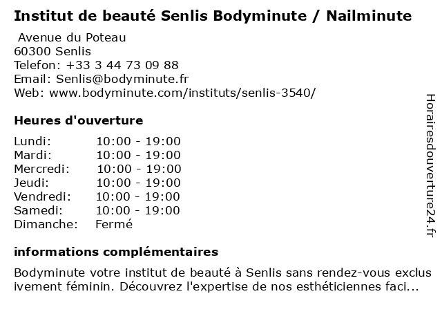 2 Institut Eclat de Beauté (Distance: 1,72 km) 108 Rue de la République, 60300 Senlis beauté, beauté soins, de, eclat, institut, manucure, massage, épilation 3 Institut de beauté Bodyminute (Distance: 9,00 km) D1016, 60740 Saint-Maximin beauté, bodyminute, de, institut 4 Institut de beauté Bodyminute (Distance: 9,60 km) 16 Rue de Creil, 60500 Chantilly beauté, bodyminute, de, institut 5 Institut Corinne Marco (Distance: 9,68 km) 13 Place Omer Vallon, 60500 Chantilly beaute, corinne, institut, maquillague, marco, massage, spa 6 Carole Institut (Distance: 9,87 km) 20 Rue Edouard Vaillant, 60100 Creil beauté, carole, esthétique, institut, onglerie, soins |