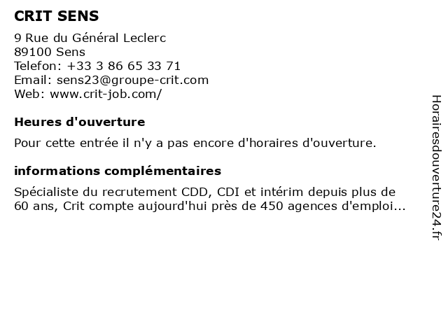 1 CRIT NOGENT-SUR-SEINE (Distance: 36,61 km) 3 Avenue Beauregard, 10400 Nogent-sur-Seine crit, nogent, seine, sur 4 Crit Job (Distance: 48,77 km) 1 Boulevard du Maréchal Joffre, 77300 Fontainebleau crit, intérim, job, recrutement |