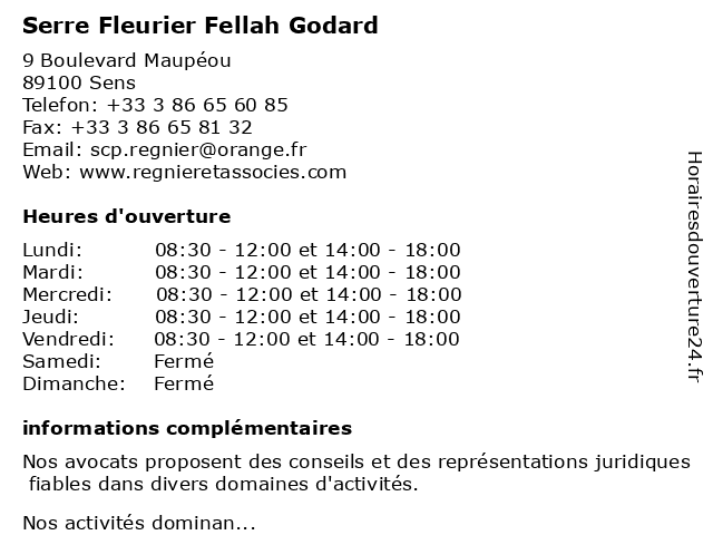 1 Maître Thierry Fleurier - Avocat (Distance: 0,00 km) 9 Boulevard Maupéou, 89100 Sens avocat, fleurier, justice, lois, maitre, maître, thierry 3 Fanny Godard - Sage-femme (Distance: 1,64 km) 1 avenue Pierre de Coubertin, 89100 Sens consultation, docteur, dr, fanny, femme, godard, med, médecin, sage, traitement 4 Godard (Distance: 2,75 km) 20 rue Longues Raies, 89100 Sens bricolage, entretien, godard, outillage, quincaillerie, vente 6 Serre de winter (Distance: 38,56 km) - Le Fourneau, 89250 Mont-Saint-Sulpice de, fleurs, jardin, plantes, potagers, serre, végétal, winter |