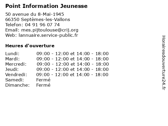 1 Point Information Jeunesse (Distance: 0,03 km) . Place Didier-Tramoni, 13240 Septemes Les Vallons administration, assoc, information, jeunesse, point, services, services publics 2 Point Information Jeunesse (Distance: 1,52 km) 34 Avenue du Vallon-d'Ol, 13015 Marseille administration, assoc, information, jeunesse, point, services, services publics 3 Point Information Jeunesse (Distance: 3,34 km) . Boulevard Du Commandant Tholon, 13015 Marseille administration, assoc, information, jeunesse, point, services, services publics 4 Point Information Jeunesse (Distance: 4,82 km) 38 Avenue de la Viste, 13015 Marseille administration, assoc, information, jeunesse, point, services, services publics 5 Point Information Jeunesse (Distance: 4,89 km) . Place de l'Hôtel-de-Ville, 13320 Bouc-Bel-Air administration, assoc, information, jeunesse, point, services, services publics 6 Point Information Jeunesse (Distance: 9,76 km) 53 Avenue de Frais-Vallon, 13013 Marseille administration, assoc, information, jeunesse, point, services, services publics |