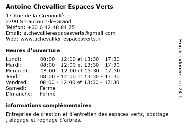 2 Eurl Aisne Espaces Verts (Distance: 8,21 km) 64 Grande Rue, 02760 Francilly-Selency aisne, espaces, eurl, verts 4 Musée Antoine Lécuyer (Distance: 9,74 km) 28 rue Antoine Lécuyer, 02100 Saint-Quentin antoine, concerts, conférences d’histoire des arts, expositions, lécuyer, musée 5 TAYON SAS ESPACES VERTS (Distance: 17,30 km) 16 Rue Anciens Combattants Afn Tom, 02302 Chauny espaces, sas, tayon, verts 6 Pierre Antoine Basile Benjamin (Distance: 18,23 km) 1 Rue Seruzier, 02800 Charmes antoine, basile, benjamin, pierre, restaurants |