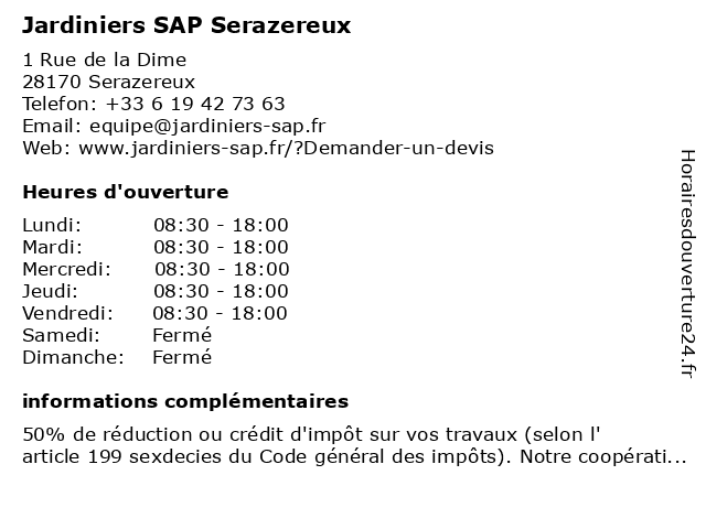 1 Jardiniers SAP Charpont (Distance: 13,65 km) 3 Impasse des colombiers, 28500 Charpont charpont, jardiniers, sap 2 Jardiniers SAP St Arnoult Des Bois (Distance: 14,41 km) 10 Rue des Betoires, 28190 Saint-Arnoult-des-Bois arnoult, bois, des, jardiniers, sap, st 3 Jardiniers SAP Fontaine La Guyon (Distance: 14,49 km) 6 Rue de Boissay, 28190 Fontaine-la-Guyon fontaine, guyon, jardiniers, la, sap 4 Jardiniers SAP Chateaubourg (Distance: 17,18 km) Place de L Hôtel de ville, 35220 Châteaubourg chateaubourg, jardiniers, sap 5 Jardiniers SAP Dreux (Distance: 18,46 km) 26 Rue de la Sablonnière, 28100 Dreux dreux, jardiniers, sap 6 Jardiniers SAP Chartres (Distance: 18,57 km) 51 Avenue d'Orléans, 28000 Chartres chartres, jardiniers, sap |