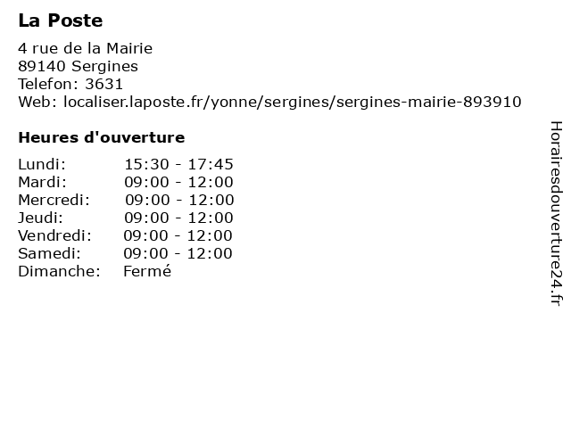 1 La Poste (Distance: 4,91 km) 12 Rue du Maréchal Leclerc, 89140 Serbonnes agence postale, courrier postal, expédition internationale, la, poste 2 La Poste (Distance: 6,96 km) 2 place de la Mairie, 89140 Courlon-sur-Yonne agence, colis, courriers, expédition, la, postale, poste, relais 3 La Poste (Distance: 9,44 km) 1 Rue Pasteur, 89140 Vinneuf agence, colis, courriers, expédition, la, postale, poste, relais 4 La Poste (Distance: 10,18 km) 1 Place de l'Eglise, 89340 Villeblevin agence, colis, courriers, expédition, la, postale, poste, relais 5 La Poste (Distance: 10,20 km) 1 bis place de la Mairie, 89340 Champigny agence, colis, courriers, expédition, la, postale, poste, relais 6 La Poste (Distance: 11,52 km) 23 Rue de la Mairie, 89100 Soucy express chronopost, la, poste, réexpédition internationale |