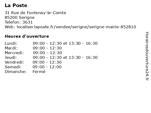 1 La Poste (Distance: 4,98 km) 13 rue Gazellerie, 85570 L'Hermenault agence, assurance, banque, banque postale, bureau de poste, chronopost, colis, courrier, dps, expéditions internationales, la, point, postale, poste, relais, timbres, téléphonie, ups, western union 2 La Poste (Distance: 7,10 km) 2 Chemin des Douves, 85200 Mervent agence, colis, courriers, expédition, la, postale, poste, relais 3 La Poste (Distance: 7,86 km) 51 Route de Fontenay, 85570 Pouillé agence, colis, courriers, expédition, la, postale, poste, relais 4 La Poste (Distance: 8,22 km) - Le Bourg, 85410 Saint-Cyr-des-Gâts agence, assurance, banque, banque postale, bureau de poste, chronopost, colis, courrier, dps, expéditions internationales, la, point, postale, poste, relais, timbres, téléphonie, ups, western union 5 6 La Poste (Distance: 14,01 km) - Place des Halles, 85240 Saint-Hilaire-des-Loges agence, assurance, banque, banque postale, bureau de poste, chronopost, colis, courrier, dps, expéditions internationales, la, point, postale, poste, relais, timbres, téléphonie, ups, western union |