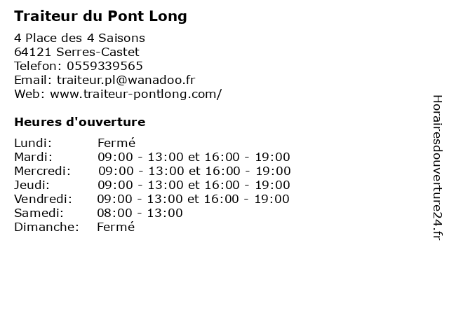 1 Traiteur Du Pont Long (Distance: 0,02 km) 6 Rue du Pont Long, 64121 Serres-Castet du, long, pont, traiteur 2 Traiteur Du Pont Long (Distance: 0,03 km) Rue du Pont Long, 64121 Serres-Castet du, long, pont, traiteur 3 Traiteur Du Pont Long (Distance: 2,62 km) Zac De l Ayguelongue, 64121 Montardon long, pont, restaurants, traiteur 4 Association Sportive du Pont Long (Distance: 0,33 km) - Allée de l' Oustau, 64121 Serres-Castet association, béarn, club, du, long, luy, pont, rugby, sportive 5 Brasserie Du Pont Long (Distance: 1,96 km) Zone Artisanale Du Pont Long, 64121 Serres Castet brasserie, long, pont, restaurants 6 Brasserie Du Pont Long (Distance: 1,96 km) Zone Artisanale Du Pont Long, 64121 Serres Castet brasserie, long, pont, restaurants, tess |