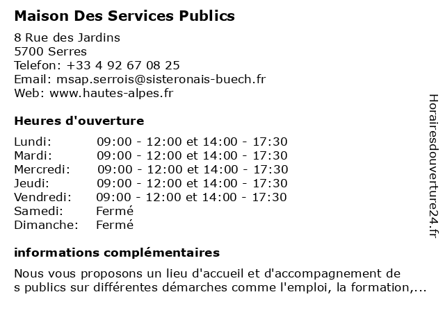 | Mardi | 09:00-12:00 et 14:00-17:30 |