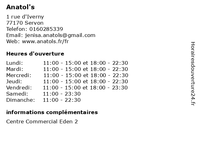 | Lundi | 11:00-15:00 et 18:00-22:30 |