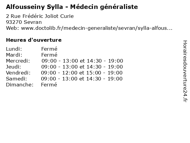 | Mercredi | 09:00-13:00 et 14:30-19:00 |
