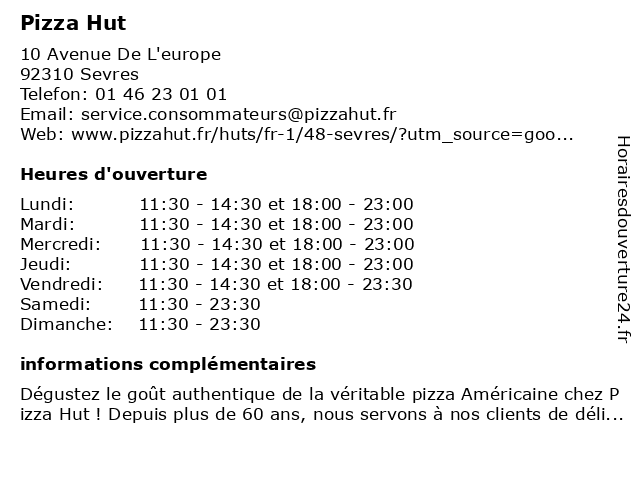 1 Pizza Hut (Distance: 4,34 km) 37 Avenue Victor Cresson, 92130 Issy-les-moulineaux hut, pizza, restaurants 4 Pizza Hut (Distance: 10,09 km) 6 rue Pierre Brossolette, 92300 Levallois-Perret hut, livraison, pizza, pizzeria, restaurant, à emporter 5 Pizza Hut (Distance: 10,75 km) 29 boulevard des italiens, 75002 Paris alimentaires, boissons, hut, pizza, restaurant 6 Pizza Hut (Distance: 11,11 km) 1 square des Innocents, 75001 Paris alimentaires, boissons, hut, pizza, restaurant |