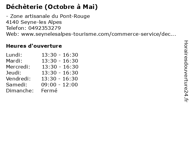 1 Déchèterie (Juin à Septembre) (Distance: 0,00 km) - Zone artisanale du Pont-Rouge, 04140 Seyne-les Alpes bois, collecte, déchets, déchèterie, gravas, huiles, juin, septembre 2 Déchèterie (Eté) (Distance: 0,00 km) - Zone artisanale du Pont-Rouge, 04140 Seyne bennes, débarras, déchèterie, détritus, eté, juin, ordures, poubelles, septembre 3 Déchèterie (Distance: 18,51 km) - route départementale 900, 04420 La Javie bennes, collecte, déchèterie, gravats, huiles, tri 4 Déchèterie (Hiver) (Distance: 26,25 km) - Route de Barles, 04000 Digne-les-Bains bois, collecte, déchets, déchèterie, gravas, hiver, huiles, mars, octobre 5 Déchèterie (Octobre à Avril) (Distance: 26,37 km) - ZA la Paroisse, 05160 Savines-le-Lac avril, déchèterie, gravats, huiles usées, la réception des déchets et écocentres, les appareils électroménagers, les déchets verts, octobre, papier et carton en quantité 6 Musée Gassendi - du 1er Octobre au 14 Mai (Distance: 29,57 km) 64 Boulevard Gassendi, 04000 Digne-les-Bains 14, 1er, au, du, exposition, gassendi, mai, musée, octobre, visite |