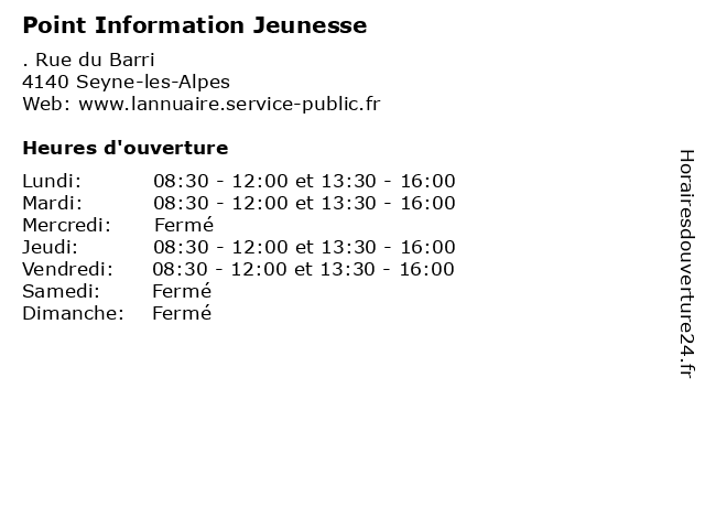 1 Point Information Jeunesse (Distance: 26,11 km) . Place Dongois, 05200 Embrun administration, assoc, information, jeunesse, point, services, services publics 2 Point Information Jeunesse (Distance: 29,18 km) . Colmars, 04370 Beauvezer administration, assoc, information, jeunesse, point, services, services publics 3 Librairie La Ruelle (Distance: 30,31 km) 18 Place du Général de Gaulle, 04000 Digne Les Bains et étrangère, la, librairie, littérature française, livres jeunesse, ruelle 4 Bureau Information Jeunesse (Distance: 30,43 km) 80 place André-Thisy, 04000 Digne-les-Bains administration, assoc, bureau, information, jeunesse, point, services, services publics 5 Bureau Information Jeunesse (Distance: 32,07 km) . Rue Pasteur-Prolongée, 05000 Gap administration, assoc, bureau, information, jeunesse, point, services, services publics 6 Point Information Jeunesse (Distance: 37,20 km) 67 Avenue Paul-Arène, 04200 Sisteron administration, assoc, information, jeunesse, point, services, services publics, sisteron |