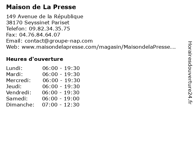 1 Maison de La Presse (Distance: 3,56 km) 26 Rue Albert Londres, 38130 Echirolles de, la, magazine, maison, papeterie, presse, services, snack 2 Maison de La Presse (Distance: 4,60 km) 240 Avenue de la République, 38320 Bresson de, la, magazine, maison, papeterie, presse, services, snack 3 Maison de La Presse (Distance: 6,00 km) 9 Place Jean Monnet -, 38640 Claix cadeaux, carterie, confiserie-boissons-food, de, française des jeux, la, librairie, maison, papeterie, pmu, presse, tabac 4 Maison de La Presse (Distance: 9,68 km) 9 Av Joliot Curie -, 38760 Varces Allieres Et Risset cadeaux, carterie, confiserie-boissons-food, de, française des jeux, la, librairie, maison, papeterie, pmu, presse, tabac 5 Maison de La Presse (Distance: 11,50 km) 31 Rue Jean Jaures, 38420 Domene cadeaux, carterie, confiserie-boissons-food, de, française des jeux, la, librairie, maison, papeterie, pmu, presse, tabac 6 Maison de La Presse (Distance: 12,15 km) 70 Place Julien Bertrand -, 38880 Autrans cadeaux, carterie, confiserie-boissons-food, de, française des jeux, la, librairie, maison, papeterie, pmu, presse, tabac |