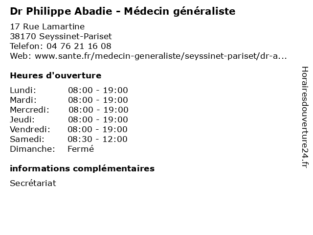 1 Dr Philippe Levy - Médecin généraliste (Distance: 0,00 km) 17 Rue Lamartine, 38170 Seyssinet-Pariset docteur, dr, generaliste, généraliste, levy, medical, médecin, philippe, soin 2 Philippe Jossa - Ostéopathe (Distance: 1,13 km) 12 Avenue Aristide Briand, 38600 Fontaine jossa, ostéo, ostéopathe, ostéopathes, philippe, soins 3 Dr Philippe Mahe - Chirurgie Urologique - secrétariat (Distance: 1,37 km) 16 bis rue Dr Hermitte, 38000 Grenoble chirurgie, consultation, docteur, dr, mahe, med, médecin, médecine, philippe, secrétariat, traitement, urologique 5 Medecin Philippe Stivalet (Acupuncteur) (Distance: 1,45 km) 4B Jean Veyrat, 38000 Grenoble acupuncteur, docteur, medecin, philippe, sante, services, stivalet 6 Maître Philippe Simon - Avocat (Distance: 1,77 km) 7 Place Firmin Gautier, 38000 Grenoble avocat, avocate, avocats, civils, droits, juridiques, maître, philippe, simon, sinon |