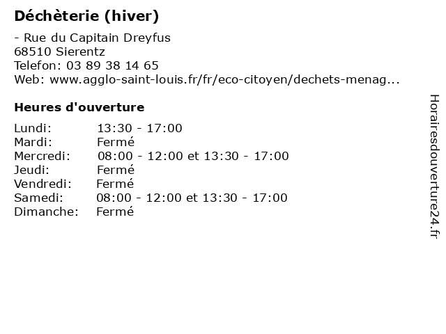 1 Déchèterie (hiver) (Distance: 4,85 km) - Rue Winston Churchill, 68870 Bartenheim dechets, dechetterie, décheterie, déchèterie, hiver 2 Déchèterie (été) (Distance: 0,00 km) - Rue du Capitain Dreyfus, 68510 Sierentz dechets, dechetterie, décheterie, déchèterie, été 3 Déchèterie (Distance: 7,40 km) - de Bartenheim, 68870 Bartenheim déchèterie, gravats, huiles usées, la réception des déchets et écocentres, les appareils électroménagers, les déchets verts, papier et carton en quantité 4 Déchèterie (Distance: 11,66 km) - d'Ottmarsheim, 68490 Ottmarsheim déchèterie, gravats, huiles usées, la réception des déchets et écocentres, les appareils électroménagers, les déchets verts, papier et carton en quantité 5 Déchèterie (Distance: 11,73 km) - Rue de Saint-Louis, 68220 Hésingue déchèterie, gravats, huiles usées, la réception des déchets et écocentres, les appareils électroménagers, les déchets verts, papier et carton en quantité 6 Déchèterie (Distance: 12,48 km) - de l'Ill, 68110 Illzach déchèterie, gravats, huiles usées, la réception des déchets et écocentres, les appareils électroménagers, les déchets verts, papier et carton en quantité |