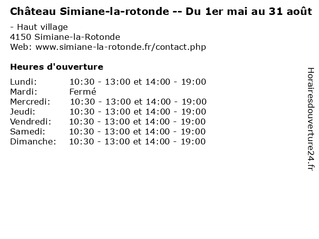 | Dimanche | 10:30-13:00 et 14:00-19:00 |
