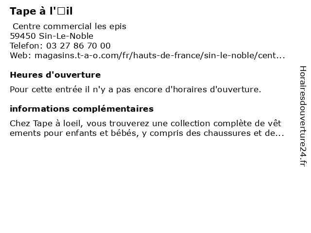 1 Tape à l'oeil - DECHY (Distance: 0,65 km) Rue James Tobin Parc Du Luc, 59187 DECHY dechy, l'oeil, magasin de vêtements pour bébés, mode, tape 2 Tape à l'oeil - Noyelles-Godault (Distance: 11,65 km) 43 Boulevard Maréchal Juin, 62950 Noyelles-Godault godault, l'oeil, magasin de vêtements pour bébés, mode, noyelles, tape 3 Tape à l'œil (Distance: 20,72 km) 2 rue Jean Jaurès, 59161 Escaudœuvres l'œil, mode bébé, mode pour enfants, tape, vêtements pour bébés, vêtements pour enfants 4 Tape à l'Oeil (Distance: 26,85 km) - rocade du Nord, 59230 Saint-Amand-les-Eaux bébé, enfant, habillement, l'oeil, magasin, mode, tape 5 Tape à l'Oeil (Distance: 28,77 km) . RN 352, 59320 Haubourdin beaute, cafe, chausures, enfants, l'oeil, mode femmes, mode hommes, restaurant, sport, tape 6 Tape à l'œil (Distance: 30,83 km) 43 Route Nationale, 62950 Noyelles auchan, centre, commercial, l'œil, noyelles, tape |