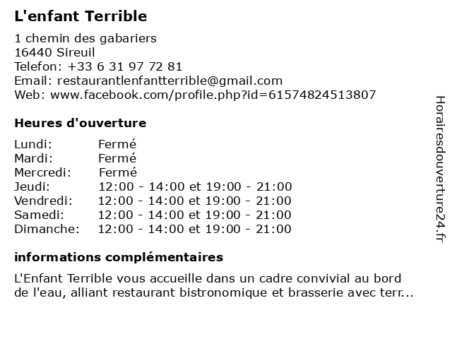 | Lundi | Fermé |