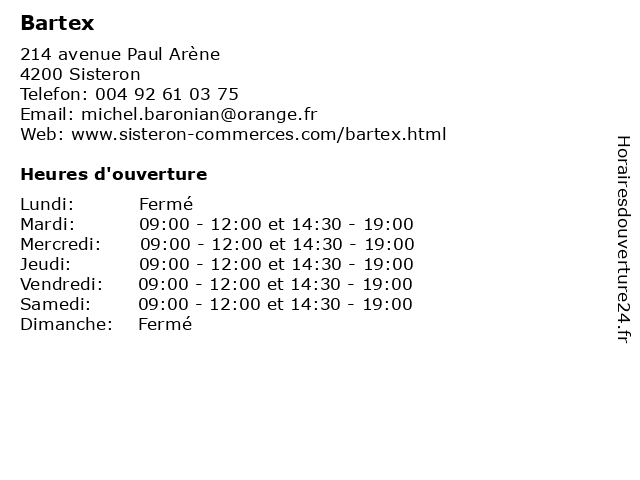 | Samedi | 09:00-12:00 et 14:30-19:00 |