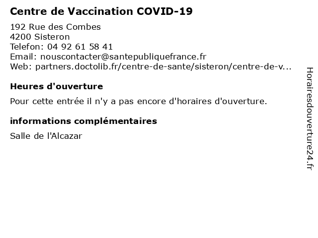 | 1 Centre de Vaccination COVID-19 - CH Buech Durance (Distance: 17,02 km) n/a Rue du Docteur Provansal, 05300 Laragne-Montéglin 19, buech, centre, ch, covid, covid 19, covid19, de, du, durance, médecin, médecine, médical, test, vaccin, vaccination, vaccins 2 Dr Iona Valentina Gheorghiu - Médecin généraliste (Distance: 0,25 km) 46 avenue Jean Moulin, 04200 Sisteron consultation, docteur, dr, gheorghiu, généraliste, iona, médecin, médecine générale, soin, vaccination, valentina 3 Dr Ibrahim Turki - Médecin généraliste (Distance: 1,58 km) 43 Avenue Jean des Figues, 04200 Sisteron consultation, dr, généraliste, ibrahim, médecin, santé, turki, vaccination 4 Dr Monique Davin-Hugon - Médecin généraliste (Distance: 4,40 km) 17 Allée des Genêts, 04200 Sisteron consultation, davin, davin-hugon, dr, généraliste, hugon, monique, médecin, santé, vaccination 5 Centre de Vaccination COVID-19 - CHI Digne les Bains (Distance: 24,01 km) n/a Quartier Saint Christophe, 04000 Digne-les-Bains 19, bains, centre, chi, covid, covid 19, covid19, de, digne, du, les, médecin, médecine, médical, test, vaccin, vaccination, vaccins 6 Centre de Vaccination COVID-19 - Palais des Congrès (Distance: 25,63 km) 1 Place de la République/rue de la République, 04000 Digne-les-Bains 19, centre, congrès, covid, covid 19, covid19, de, des, médecin, médecine, médical, palais, test, vaccin, vaccination, vaccins |