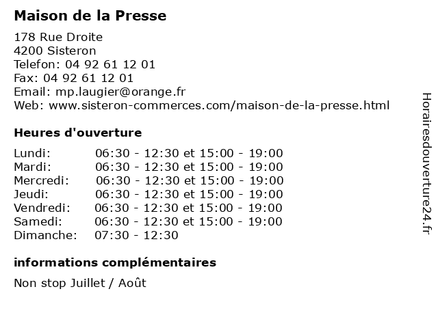 Samedi | 06:30-12:30 et 15:00-19:00 |