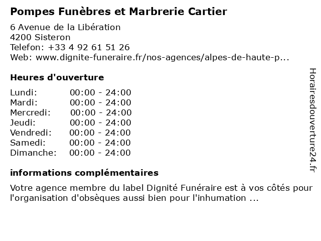 1 Pompes funèbres PFG SISTERON (Distance: 0,13 km) 22 Avenue de la Libération, 04200 Sisteron avis de décès, crémation, entretien de sépulture, fleurs deuil, formalités après obsèques, funèbres, inhumation, marbrerie, monument funéraire, pfg, pompes, pompes funèbres, prévoyance obsèques, sisteron 2 Pompes Funèbres des Alpes (Distance: 0,16 km) Rue des Cordeliers, 04200 Sisteron alpes, des, funèbres, pompes 3 Pompes Funèbres et Marbrerie Steenkiste (Distance: 11,42 km) 22 Allée des Érables, 04160 Château-Arnoux-Saint-Auban avis de décès, crémation, entretien de sépulture, et, fleurs deuil, formalités après obsèques, funèbres, inhumation, marbrerie, monument funéraire, pompes, pompes funèbres, prévoyance obsèques, steenkiste 4 Pompes funèbres PFG CHÂTEAU-ARNOUX-SAINT-AUBAN (Distance: 13,56 km) 11 Rue Lavoisier, 04160 Château-Arnoux-Saint-Auban arnoux, auban, avis de décès, château, crémation, entretien de sépulture, fleurs deuil, formalités après obsèques, funèbres, inhumation, marbrerie, monument funéraire, pfg, pompes, pompes funèbres, prévoyance obsèques, saint 5 Pompes Funèbres Rolando (Distance: 16,63 km) 13 Place de la Fontaine, 05300 Laragne-Montéglin assurance obsèques, avis de décès, crémation, démarches obsèques, entretien de tombe, fleurs deuil, funèbres, inhumation, monument funéraire, pierre tombale, pompes, pompes funèbres, rolando 6 Pompes Funèbres et Marbrerie CARTIER - PFG LARAGNE-MONTEGLIN (Distance: 16,70 km) 7 Rue de L Hôtel de ville, 05300 Laragne-Montéglin avis de décès, cartier, crémation, entretien de sépulture, et, fleurs deuil, formalités après obsèques, funèbres, inhumation, laragne, marbrerie, monteglin, monument funéraire, pfg, pompes, pompes funèbres, prévoyance obsèques |