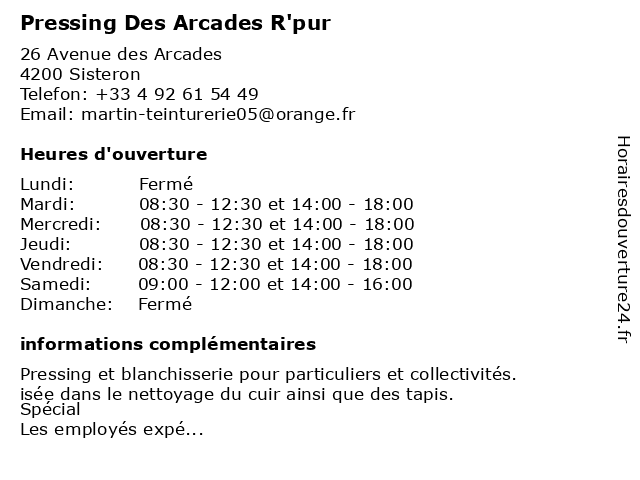1 Alimentation des Arcades Roux René (Distance: 0,04 km) 32 avenue des Arcades, 04200 Sisteron alimentation, arcades, colis, colis®, des, generale, relais, rene, rené, roux, services postaux et de livraison 2 Brasserie Les Arcades (Distance: 0,05 km) 4 avenue des Arcades, 04200 Sisteron alcool, arcades, bar, brasserie, café, les, restaurant 3 Pharmacie des Arcades (Distance: 0,10 km) 8 avenue des Arcades, 04200 Sisteron arcades, des, homéopathie, médicaments, orthopédie, parapharmacie, pharmacie 4 Lave Net Press (Distance: 35,43 km) - Quartier Boulangère, 04140 Selonnet lavage, lave, laver, laverie, net, press, pressing, écologiques 6 Gréoux Pressing (Distance: 48,66 km) - Avenue des Thermes, 04800 Gréoux-les-Bains gréoux, laverie, linge, nettoyage, pressing |