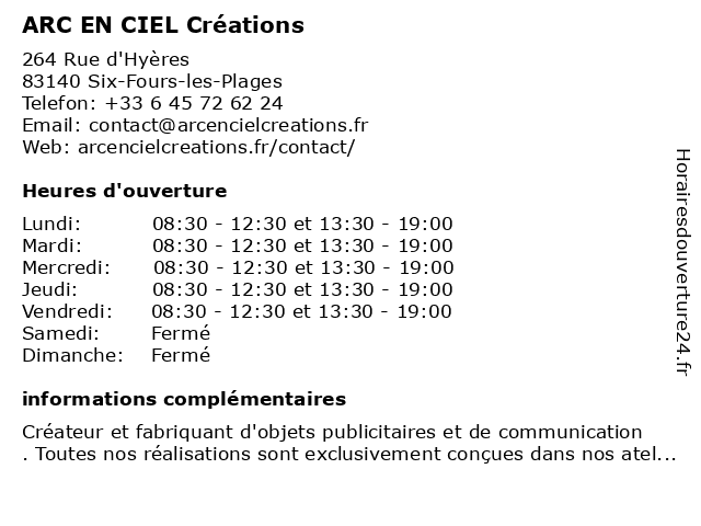 | Mercredi | 08:30-12:30 et 13:30-19:00 |