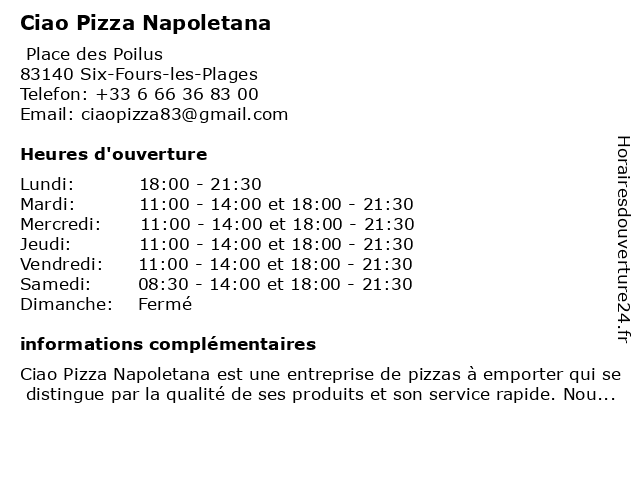 | Samedi | 08:30-14:00 et 18:00-21:30 |