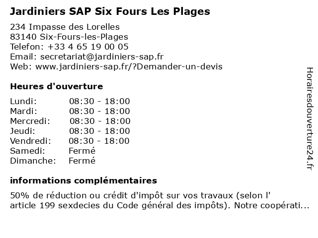 1 Jardiniers SAP Six Fours Les Plages (Distance: 0,51 km) 68 Chemin Rayolet, 83140 Six-Fours-les-Plages fours, jardiniers, les, plages, sap, six 2 Jardiniers SAP Six Fours Les Plages (Distance: 1,71 km) 2051 Chemin de la Forêt, 83140 Six-Fours-les-Plages fours, jardiniers, les, plages, sap, six 3 Jardiniers SAP Six Fours Les Plages (Distance: 2,28 km) 391 Chemin de Larmé, 83140 Six-Fours-les-Plages fours, jardiniers, les, plages, sap, six 4 Jardiniers SAP Six Fours Les Plages (Distance: 3,93 km) 107 Rue du Colonel d'Artaud, 83140 Six-Fours-les-Plages fours, jardiniers, les, plages, sap, six 5 Jardiniers SAP Six Fours Les Plages (Distance: 4,11 km) 91 Rue de la Vallée d'Ocre, 83140 Six-Fours-les-Plages fours, jardiniers, les, plages, sap, six 6 Sap Saint Vincent SAPSV (Distance: 2,69 km) 601 Avenue Maréchal de Lattre de Tassigny, 83140 Six-Fours-les-Plages saint, sap, sapsv, vincent |
