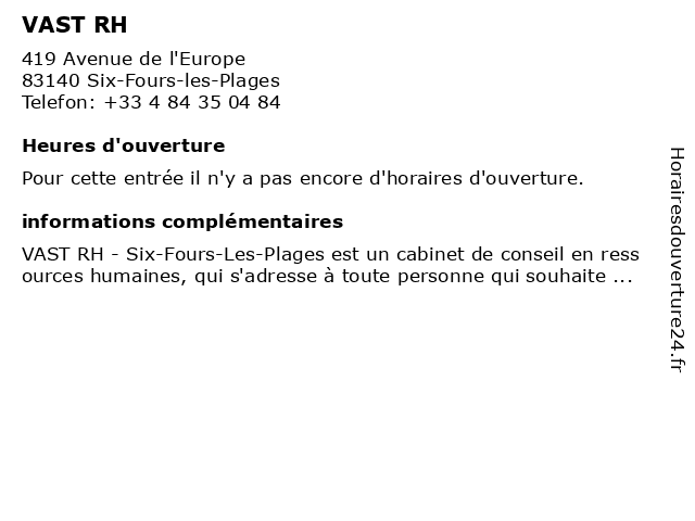 3 Anthea RH (Distance: 6,71 km) 16 Avenue Vauban, 83000 Toulon anthea, conseil rh, formation, gestion des talents, management, recrutement, rh, solution rh 4 VAST RH Toulon - Bilan de compétences (Distance: 6,81 km) 31 Rue Chevalier Paul, 83000 Toulon bilan, compétences, de, rh, toulon, vast 6 Convergence Conseil RH (Distance: 7,29 km) 7 Rue François Fabié, 83000 Toulon coaching, conseil, convergence, convergenge, manager, rh, toulon |
