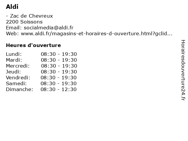2 Aldi (Distance: 0,07 km) - Rue Jacques Brel, 02200 Soissons aldi, alimentaire, alimentation, courses, distributeur, hypermarché, supermarché, supérette, épicerie 3 ALDI (Distance: 1,82 km) 74 Avenue de Compiègne, 02200 Soissons aldi, aldi près de moi, courses près de moi, magasin, magasin discount, magasin discount près de moi, supermarché, supermarché près de moi, supermarchés, supermarchés près de moi, épicerie, épicerie près de chez moi 4 Aldi (Distance: 1,85 km) 74 Avenue de Compiègne, 02200 Soissons aldi, alimentaire, alimentation, courses, discount, distributeur, fruits, légumes, supermarché, supérette, épicerie 5 Aldi (Distance: 16,87 km) 9/10 Rue du 7ème BCA, 02320 Pinon aldi, alimentaire, alimentation, courses, discount, distributeur, fruits, légumes, supermarché, supérette, épicerie 6 |
