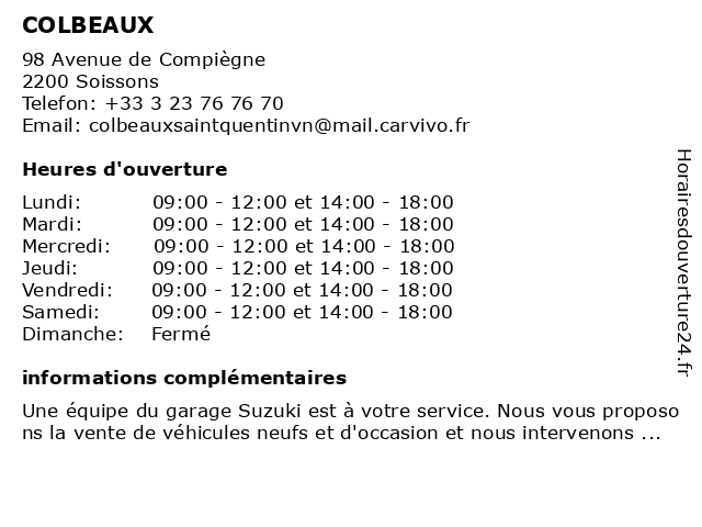 2 Suzuki - COLBEAUX SAS - Service Après-Vente (Distance: 0,00 km) 98 Avenue de Compiègne, 02000 Soissons après, colbeaux, entretien, révisions, sas, service, services d'automobiles, suzuki, vente, vidanges 3 Suzuki - COLBEAUX SAS - Espace Occasions (Distance: 0,00 km) 98 Avenue de Compiègne, 02000 Soissons colbeaux, entretien, espace, occasions, révisions, sas, services d'automobiles, suzuki, vidanges 4 Suzuki - COLBEAUX SAS - Espace Commercial (Distance: 0,00 km) 98 Avenue de Compiègne, 02000 Soissons colbeaux, commercial, entretien, espace, révisions, sas, services d'automobiles, suzuki, vidanges 6 |