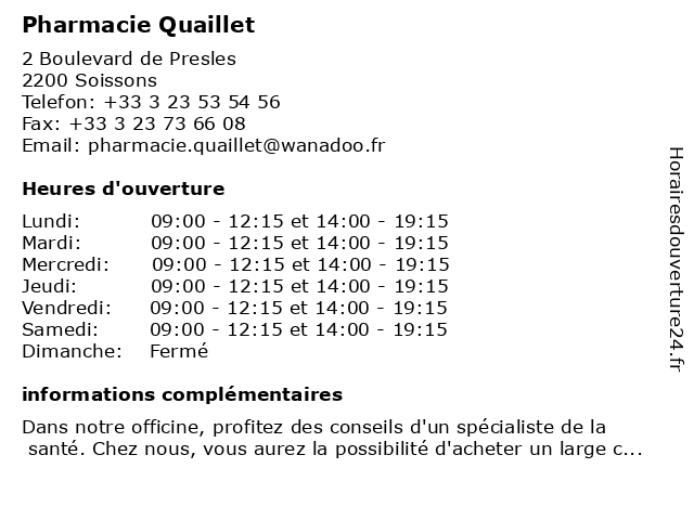 1 Pharmacie Daoudi - Forum Santé Pharmacie (Distance: 0,56 km) - Avenue Robert Schumann, 02200 Soissons daoudi, forum, medicaments, parapharmacie, pharmacie, santé 2 Pharmacie de Maupas (Distance: 0,67 km) 2 Rue Jean Moulin, 02200 Soissons de, maupas, médicaments, pharmacie, santé, service 3 Pharmacie Saint Martin (Distance: 1,47 km) 37 Rue Saint Martin, 02200 Soissons martin, médicaments, pharmacie, saint, santé, service 4 Pharmacie de La République (Distance: 1,47 km) 2 place de la République, 02200 Soissons de, herboristerie, la, médicaments, paramédical, parapharmacie, pharmacie, pharmacien, république, santé, traitements 5 Pharmacie Saint Germain (Distance: 2,12 km) 33 avenue de Reims, 02200 Villeneuve-Saint-Germain conseils, germain, lunettes, médicaments, optique, orthopédie, parapharmacie, pharmacie, saint 6 Pharmacie Tasserit (Distance: 3,46 km) 1029 Rue Gambetta, 02200 Courmelles conseils, médicaments, orthopédie, parapharmacie, pharmacie, tasserit |
