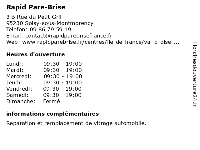 1 Rapid Pare-Brise (Distance: 4,43 km) 189 boulevard André Bremont, 95320 Saint-Leu-la-Forêt auto, bris de glace, brise, centre, pare, pare brise, rapid, réparation 2 Rapid Pare-Brise (Distance: 5,09 km) 133 route de Saint Leu, 93800 Épinay-sur-Seine brise, pare, rapid, réparation et remplacement de pare-brise, spécialiste en pose 3 Rapid Pare-Brise (Distance: 5,95 km) 141 avenue Louis Roche, 92230 Gennevilliers brise, pare, rapid, réparation et remplacement de pare-brise, spécialiste en pose 4 Rapid Pare-Brise (Distance: 9,41 km) 9 Rue Dulcie September, 93120 La Courneuve accessoires, brise, motos, pare, pare-brise, rapid, voitures 5 Rapid Pare-Brise (Distance: 10,07 km) 41 Rue Ernest Renan, 78800 Houilles accessoires, brise, motos, pare, pare-brise, rapid, voitures 6 Rapid Pare-Brise (Distance: 10,65 km) 148 avenue Maurice Berteaux, 78500 Sartrouville auto, bris de glace, brise, centre, pare, pare brise, rapid, réparation |