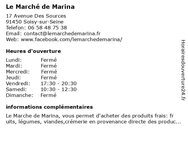 1 Marché à Ris-Orangis (Distance: 2,39 km) - Ville, 91130 Ris-Orangis frutas, hortalizas, marché, mercado, orangis, ris, verduras 2 San Marina (Distance: 2,98 km) 2 Boulevard de l'Europe, 91000 Evry accessoires, chaussures, enfant, femme, homme, marina, san 3 Imparator Marché (Distance: 4,90 km) 47 avenue Paul Maintenant, 91100 Corbeil-Essonnes alimentation, fruits, imparator, légumes, marché, supermarché, épicerie 4 Marché à Mandres-les-Roses (Distance: 4,95 km) . Place Tours, 94520 Mandres-les-Roses frutas, hortalizas, les, mandres, marché, mercado, roses, verduras 5 Pharmacie du Marché (Distance: 5,16 km) 5 Place Anatole France, 91270 Vigneux-sur-Seine aromathérapie, du, homéopathie, marché, médicament, pharmacie, pharmacien giphar 6 Marché à Savigny-sur-Orge (Distance: 5,46 km) - Place du Miroir, 91600 Savigny-sur-Orge frutas, hortalizas, marché, mercado, orge, savigny, sur, verduras |