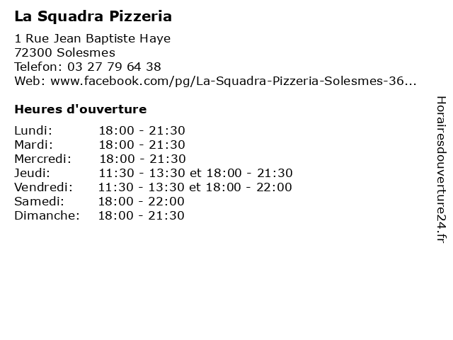 1 La Squadra Pizzeria (Distance: 18,44 km) 12 Rue Du General De Gaulle, 59400 Cambrai bar, bistro, bistrot, brasserie, café, la, pizzeria, pub, restaurant, restauration, resto, squadra 2 La Squadra (Distance: 0,01 km) 1 Rue Jean Baptiste Haye, 59730 Solesmes adgp, la, restaurants, restauration, squadra 3 Pizzeria du St B (Distance: 9,62 km) 235 Rue Henri Barbusse, 59540 Caudry du, emporter, pizza, pizzeria, restaurant, st 4 Pizzeria le Cateau (Distance: 9,71 km) 1 Rue De Landrecies, 59360 Le Cateau Cambrésis cateau, le, pizzeria 6 |