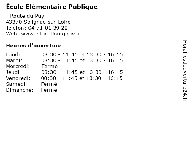 1 École Elémentaire Publique (Distance: 5,66 km) - Le Bourg, 43370 Saint-Christophe-sur-Dolaison cours, education, elémentaire, publique, services, école, élémentaire 2 École Elémentaire Publique (Distance: 9,25 km) 10 Rue Pierre de Nolhac, 43000 Le Puy-en-Velay cours, education, elémentaire, publique, services, école, élémentaire 3 École Elémentaire Publique (Distance: 10,24 km) - Rue des Écoles, 43150 Le Monastier-sur-Gazeille cours, education, elémentaire, publique, services, école, élémentaire 4 École Elémentaire Publique (Distance: 11,34 km) - Place Princesse de Polignac, 43000 Polignac cours, education, elémentaire, publique, services, école, élémentaire 5 École Elémentaire Publique (Distance: 13,61 km) 21 Route de Saint-Julien, 43150 Laussonne cours, education, elémentaire, publique, services, école, élémentaire 6 École Elémentaire Publique (Distance: 14,85 km) - Le Bourg, 43340 Landos cours, education, elémentaire, publique, services, école, élémentaire |