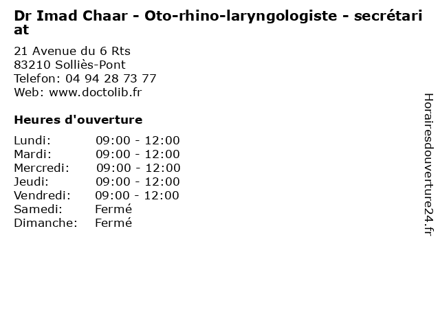 1 Dr Philippe Josselin - Oto-rhino-laryngologiste - secrétariat (Distance: 0,00 km) 21 Avenue du 6 Rts, 83210 Solliès-Pont consultation, docteur, dr, josselin, laryngologiste, med, médecin, médecine, oto, philippe, rhino, secrétariat, traitement 2 Cabinet d'ORL du Dr Pene - Oto-rhino-laryngologie (secrétariat ) (Distance: 12,03 km) 85 Avenue Foch, 83000 Toulon cabinet, consultation, d'orl, docteur, dr, du, laryngologie, oto, pene, rhino, santé, secrétariat 3 Dr Pascal Peyssonnerie - Oto-Rhino-Laryngologiste (ORL) (Distance: 49,05 km) - Chemin des Mille Ecus, 13718 Allauch chirurgie, cou, dr, et, face, laryngologie, laryngologiste, orl, oto, pascal, peyssonnerie, rhino 4 Dr.Meyer Michel Ayache-Oto-rhino-laryngologie (Distance: 52,13 km) 49 Avenue François Mignet, 13013 Marseille ayache, consultation, docteur, dr.meyer, laryngologie, michel, oto, rhino, santé 5 Dr. Jean-Paul Farjon - Oto-rhino-laryngologie (Distance: 52,99 km) 15 Avenue de Saint-Barnabé, 13004 Marseille consultation, docteur, dr., farjon, jean, laryngologie, oto, paul, rhino, santé 6 Dr. Richard Mavris-Imbert - Oto-rhino-laryngologie (Distance: 52,99 km) 15 Avenue de Saint-Barnabé, 13004 Marseille consultation, docteur, dr., imbert, laryngologie, mavris, oto, rhino, richard, santé |